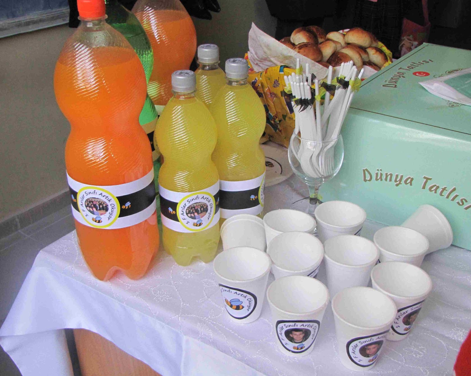 Öncelikle sınıflarının ismine uygun arılı kurabiyeler yapıldı ve en önemlisi de bu kurabiyelerin etiketlerinde her birinin resmi bulunmaktaydı. Tahmin edebileceğiniz üzere tüm öğrenciler bunlara bayıldı.Tabaklarda ve peçeteliklerde tüm sınıfın toplu fotoğrafları bardaklarda ise yine öğrencilere özel herbirinin resmi vardı.